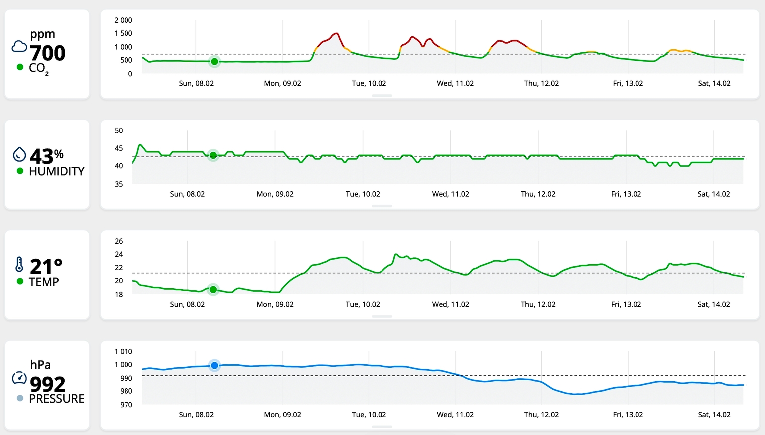 Livelli elevati possono provocare sonnolenza, calo della concentrazione e sensazione di aria “pesante”. In uffici, scuole o sale riunioni la CO₂ è spesso il primo parametro che segnala ventilazione insufficiente.
